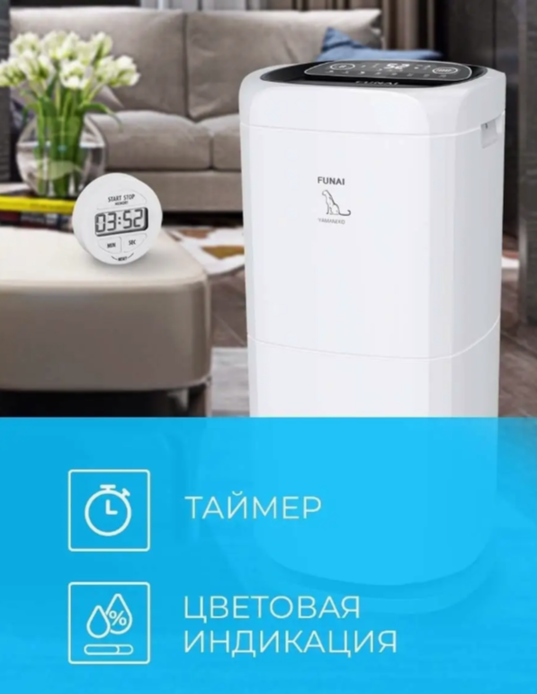 Осушитель воздуха Funai (Фунай) Yamaneko RAD-Y60F7E легко впишется в любой интерьер и перемещается благодаря четырем колесикам и удобным ручкам. Интеллектуальная система непрерывно мониторит состояние воздуха, точно поддерживая желаемый уровень влажности. Встроенный резервуар объемом 8 литров для сбора конденсата оснащен индикатором заполнения.