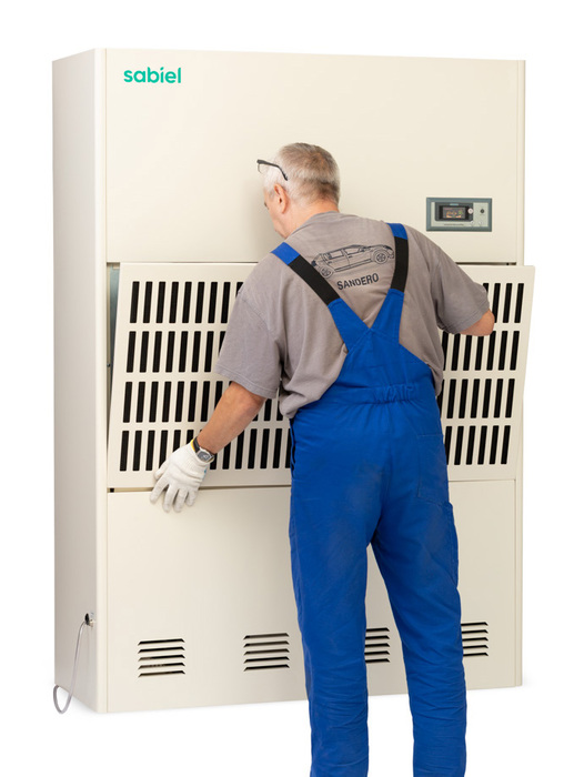 Sabiel DP170 осуществляет конденсационное осушение воздуха и устанавливается стационарно. Для данного устройства предусмотрены колеса вместо опор. В ходе осушения слив воды происходит автоматически. Отвод конденсата производится с помощью сливного патрубка. Металлический корпус надежно защищает все внутренние узлы и системы от внешнего воздействия.